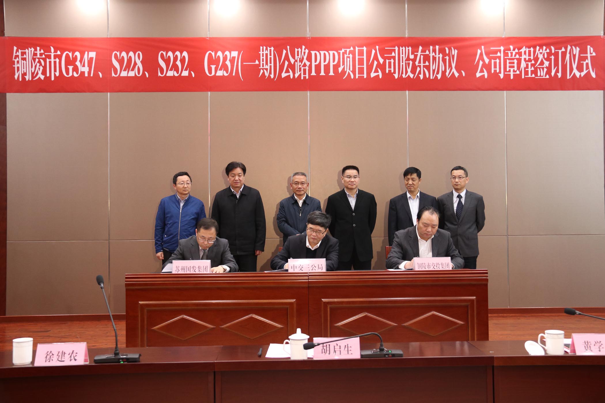 3月28日上午,我市國道347、省道228、省道232、國道237(一期)公路PPP項目公司股東協(xié)議及公司章程簽訂儀式在市綜合交通投資集團有限公司舉行。市委副書記、市長胡啟生,中交第三公路工程局有限公司黨委書記、董事長黃臘泉,蘇州國發(fā)集團總裁翟俊生,副市長黃學(xué)龍等現(xiàn)場見證。黃臘泉、翟俊生,市交投集團董事長何成龍簽訂四條公路PPP項目公司股東協(xié)議及公司章程。