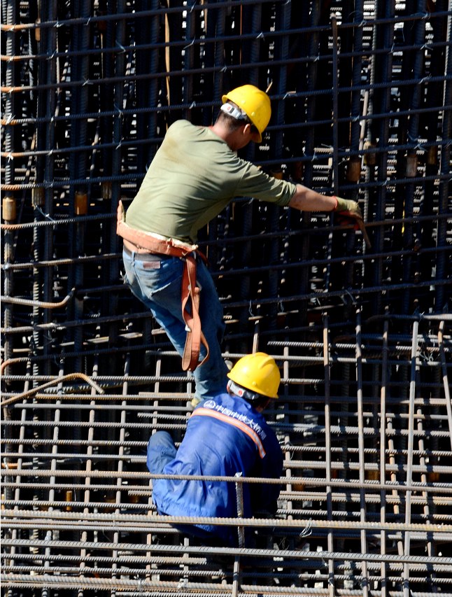 焊花飛舞、機器轟鳴,上午6時不到,鋼筋綁扎工劉友勇就和工友穿梭在“鋼筋森林”中。在下游側(cè)承臺9米多高的作業(yè)平臺上,劉友勇像蜘蛛人一樣緊貼著剛捆扎好的“樹干”,正在綁扎南主墩塔座鋼筋。承臺上沒有任何遮擋,劉友勇和工友們完全暴露在烈日下。雖然天氣很熱,但幾乎所有鋼筋工都戴著厚厚的手套,不少人的手套甚至還磨破了?!艾F(xiàn)在這時候,鋼筋表面溫度有六七十攝氏度。不戴手套拿不了鋼筋,很燙的?!眲⒂延乱贿呅χ贿呑プL燙的鋼筋,嚴格按照圖紙尺寸和間距,一根一根地將鋼筋綁扎固定起來。由于長時間觸摸滾燙的鋼筋,他的手套一直處于被汗水濕透的狀態(tài)。