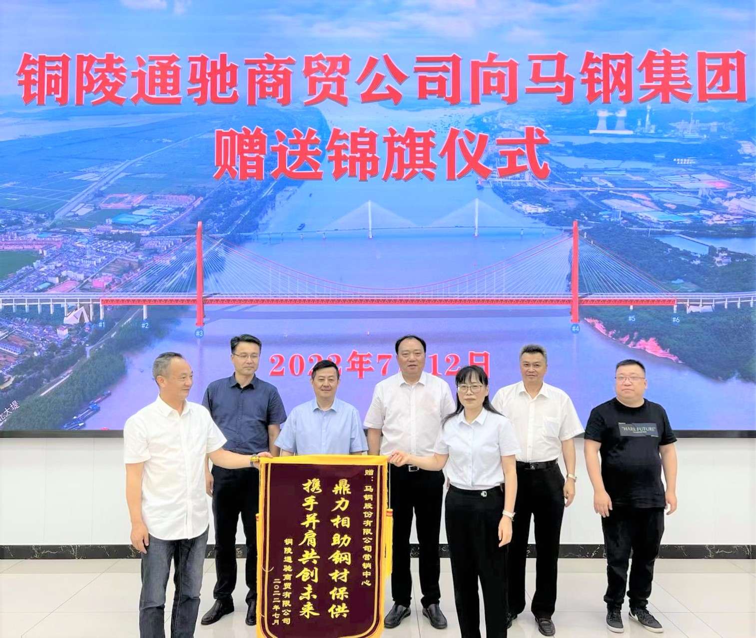 會(huì)談期間,通馳商貿(mào)向馬鋼集團(tuán)贈(zèng)送一面抒有“鼎力相助鋼材保供 攜手并肩共創(chuàng)未來(lái)”的錦旗,感謝馬鋼集團(tuán)在疫情期間對(duì)G3公鐵橋材料保供工作做出的突出貢獻(xiàn)。