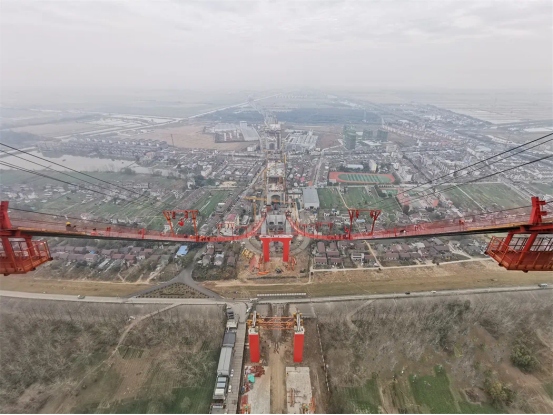 在長江水域之上,G3大橋南北主塔遙遙相望,由貓道和一根根纜索構(gòu)成的“紅色長龍”將南北兩岸緊緊相連,跨江大橋雄姿初現(xiàn),預(yù)計(jì)2024年2月初完成主纜架設(shè)。