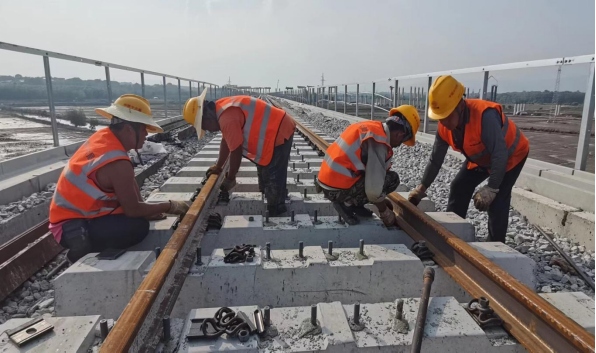 銅陵江北港鐵路專用線項(xiàng)目北起廬銅鐵路廬江南站,南至銅陵市江北港區(qū),Ⅲ級單線鐵路,設(shè)計(jì)時(shí)速為 80km/h,新建正線鋪軌全長52.047km,全線道砟約13萬立方米,采用人工鋪軌方式,鋪設(shè)25米定尺長有螺栓孔熱軋鋼軌,預(yù)計(jì)鋪軌工作將于2024年12月底基本完成。